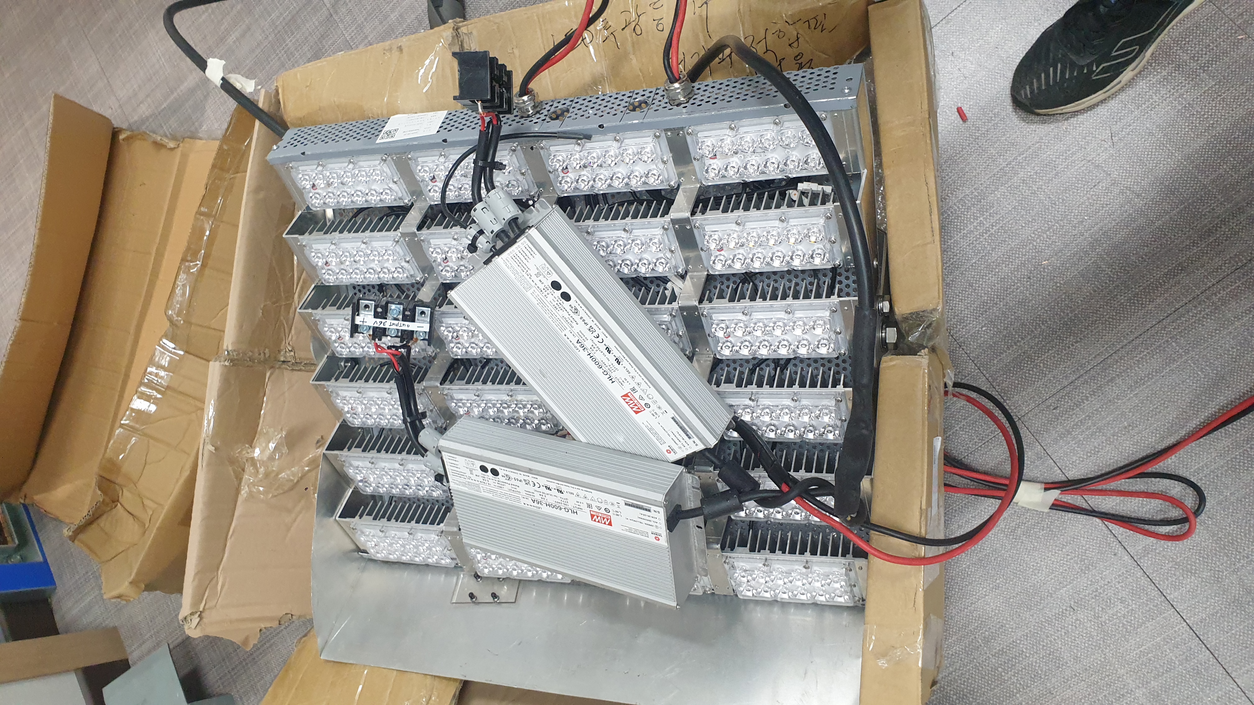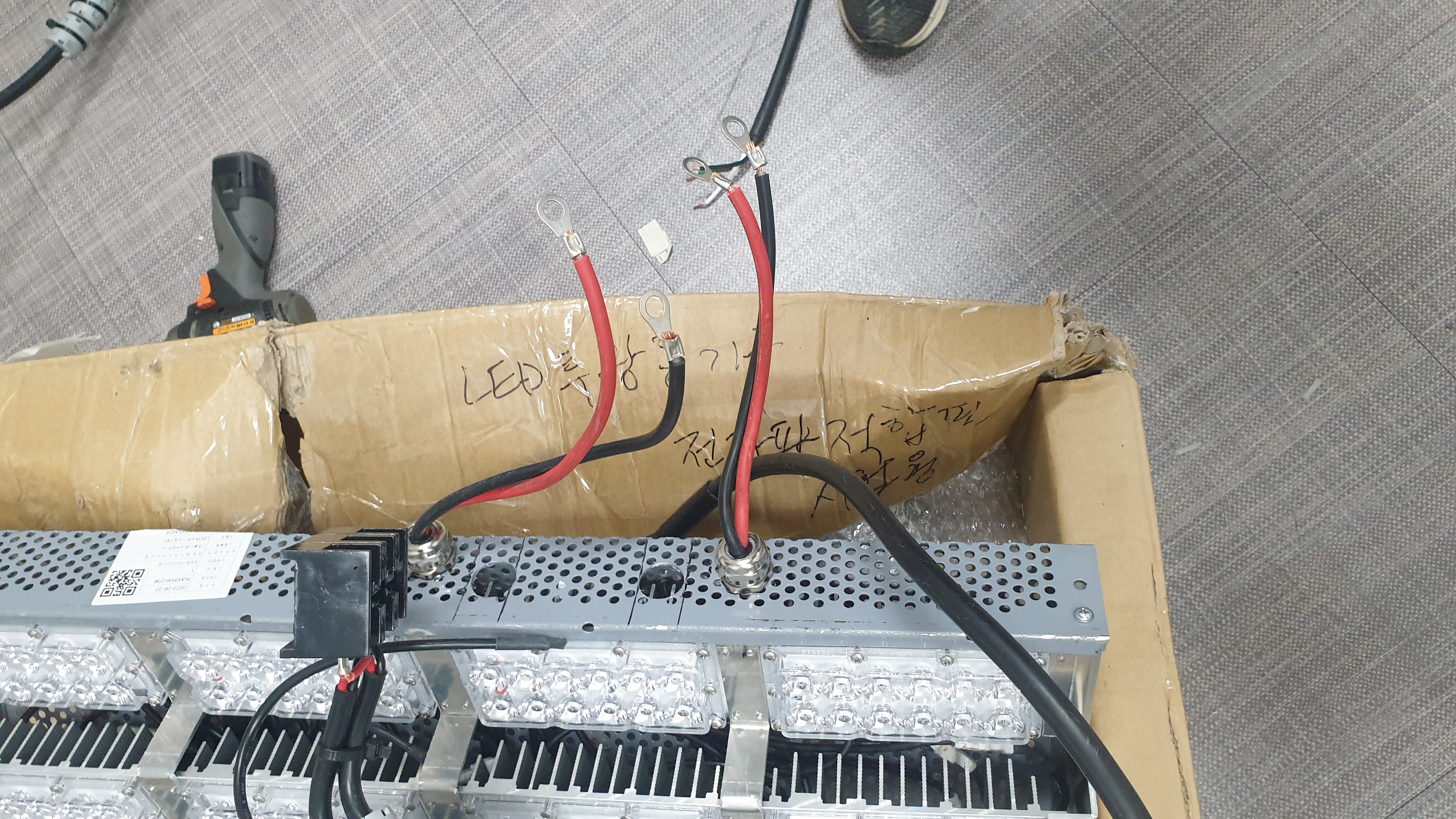 LED투광등기구 1200Watts에 대한 EMI부적합에 대해 개선작업을 하고 측정하니 종래보다는 나아졌다. 2차 측에 임시로 출력선을 1.2미터 절단해 루프를 짧게 하였다. 이후로 AC라인필터와 페라이트 클램프 코어를 임시로 추가했다.