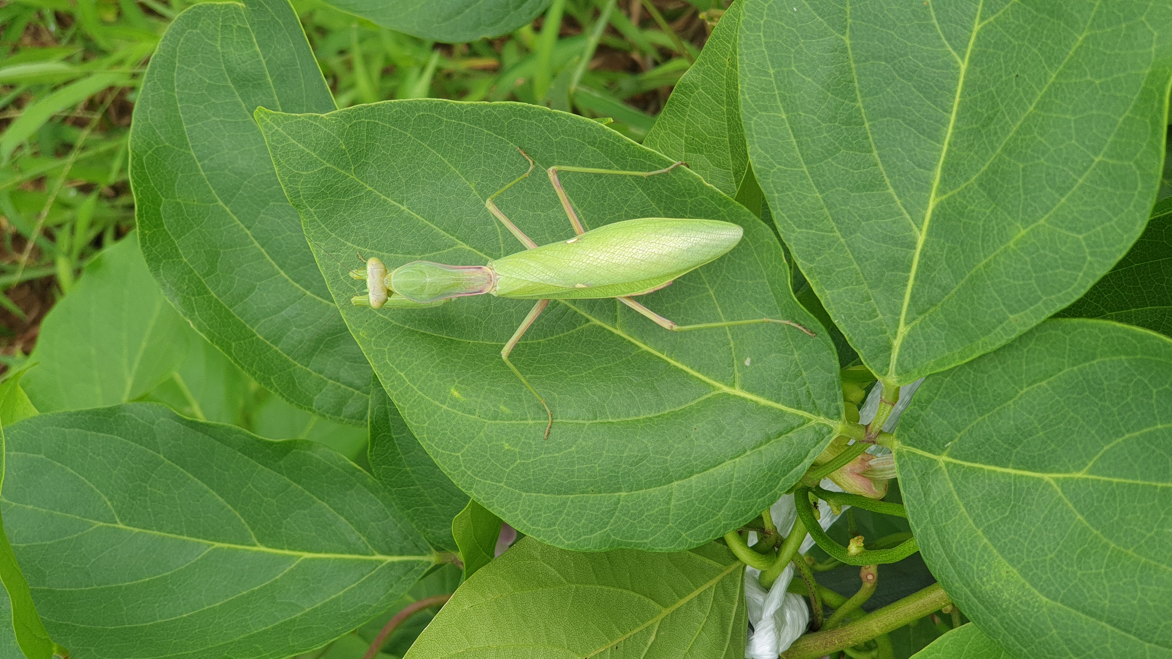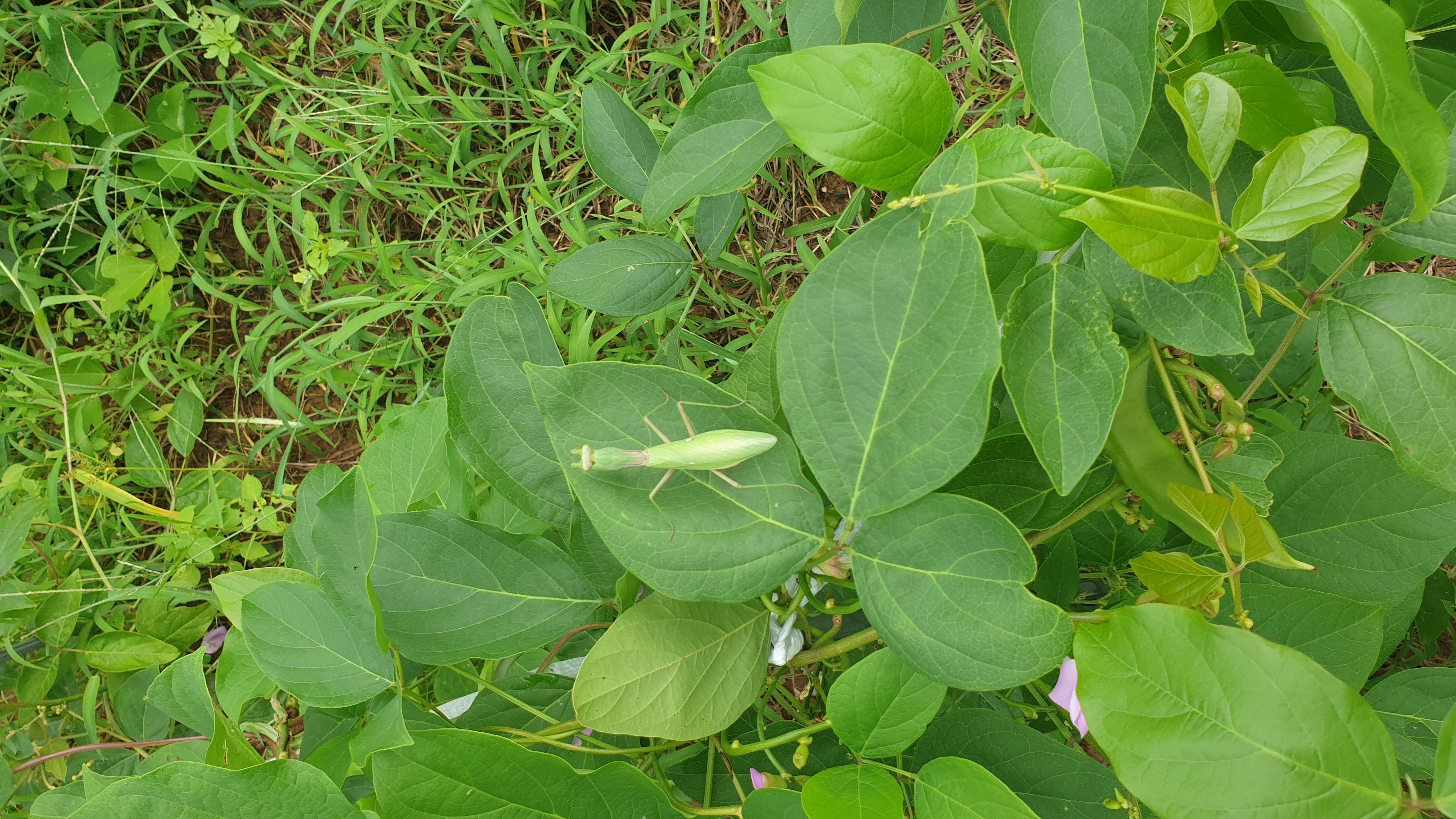 비 오는 날은 작두콩잎이 사마귀에게 비가림 해주는 쉼터가 되어 주는 것 같아
