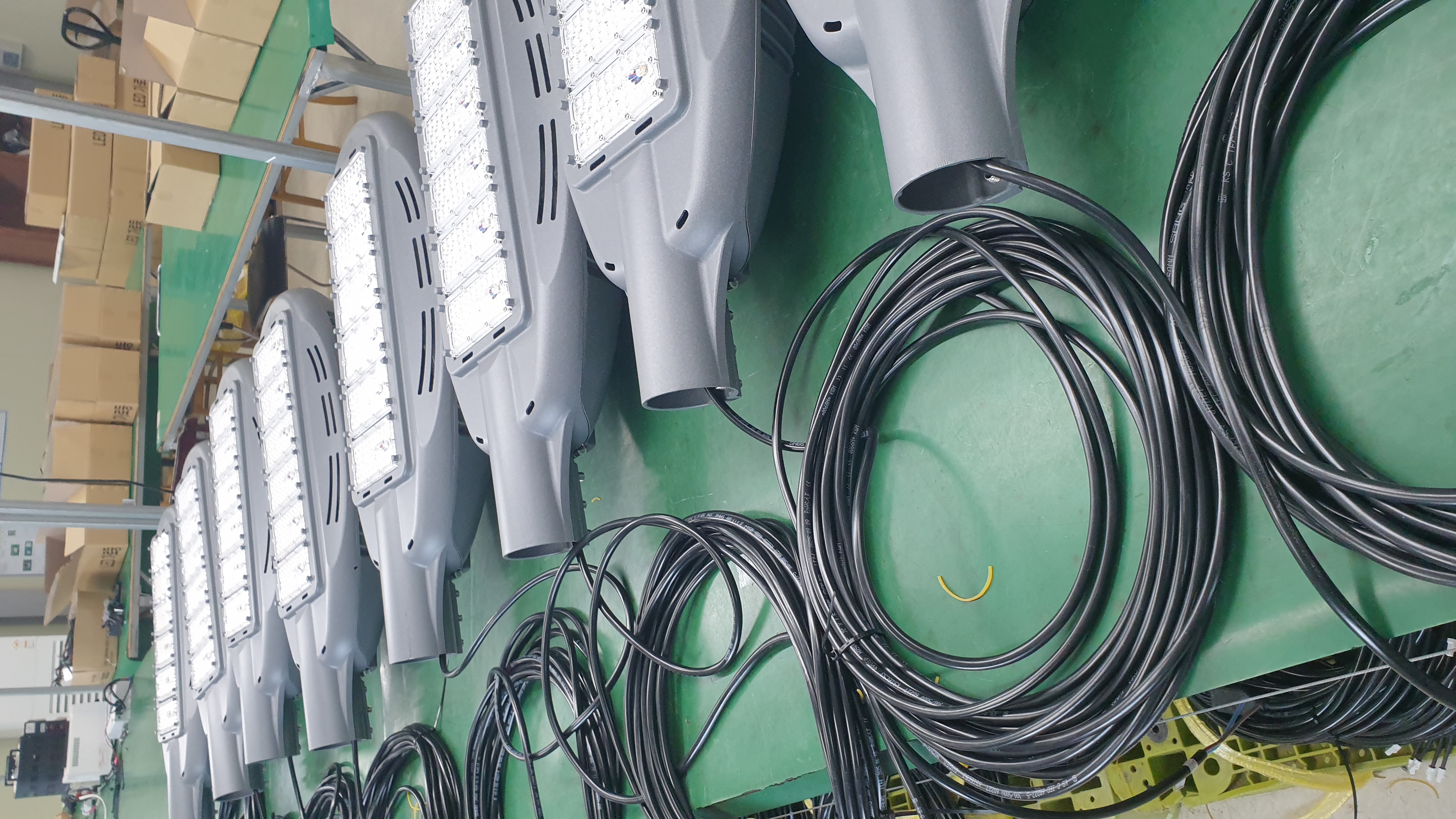 소비전력이 100와트라서 가로등주 높이가 8미터 정도로 생각했더니 실제는 10미터 정도였다. 암대 길이까지 감안하면 12미터이다. 2.5SQ×2Cores가 적용된 상태다. 부하를 고려하지 않은 과잉된 설계다.