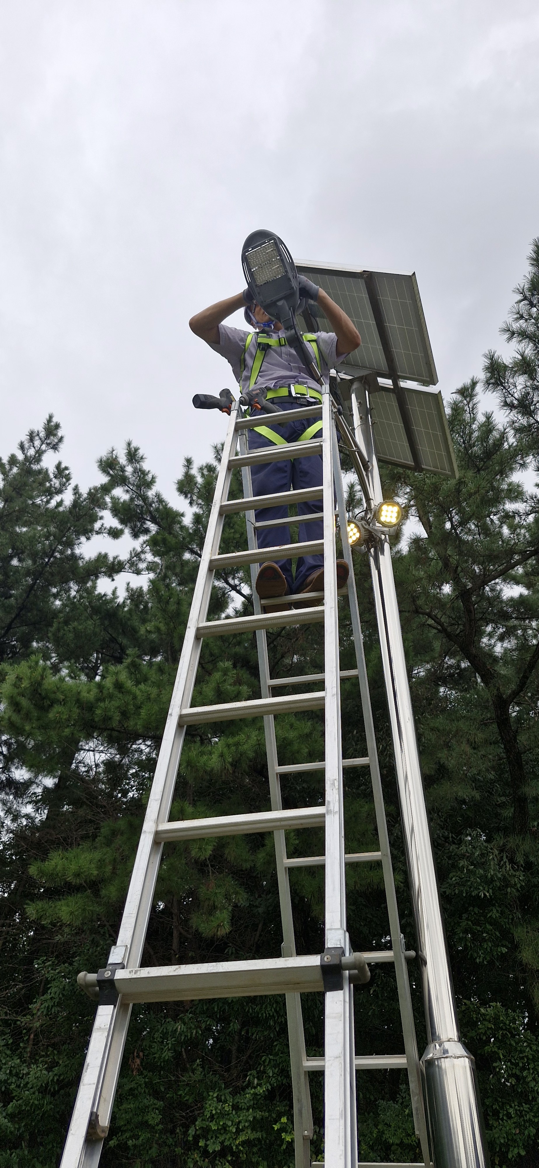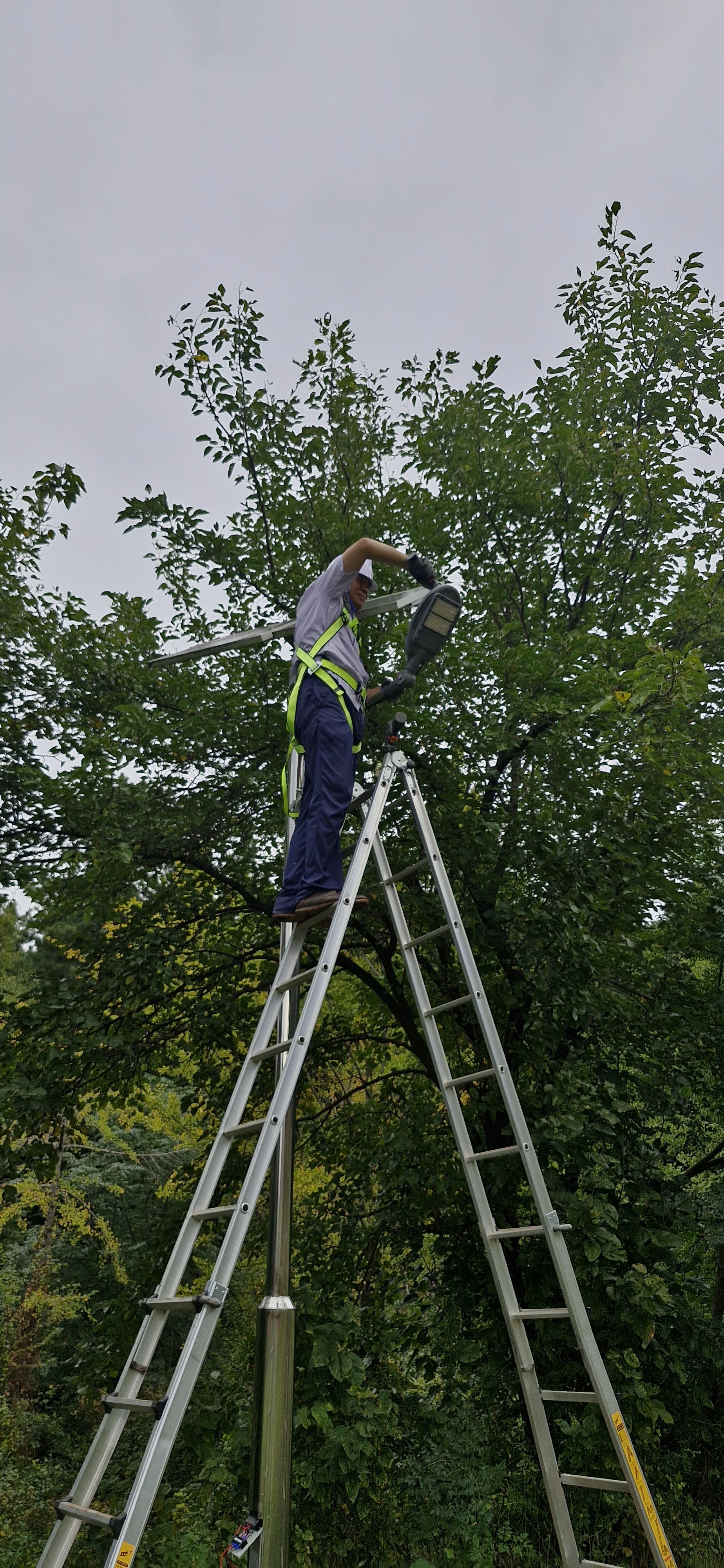 경사진 곳에 설치된 LED등기구는 등주의 4미터 높이에 설치가 되어 있다. 사다리의 안전 거치대까지 내려 사다리 전복이 없도록 하고 올라가 작업을 실시했다. 착용한 안전대의 훅 걸고리를 등주의 암대에 걸었다. 등뚜껑을 열어 보니 무선모듈의 상태표시 LED가 적색이어야 하는데 녹색이었다. 그룹설정 상태표시가 변해 있어 요인은 야간에 낙뢰 등의 영향으로 잡음이 유입되어 택트 스위치를 누른 것과 같아져 설정된 것으로 추정되었다.