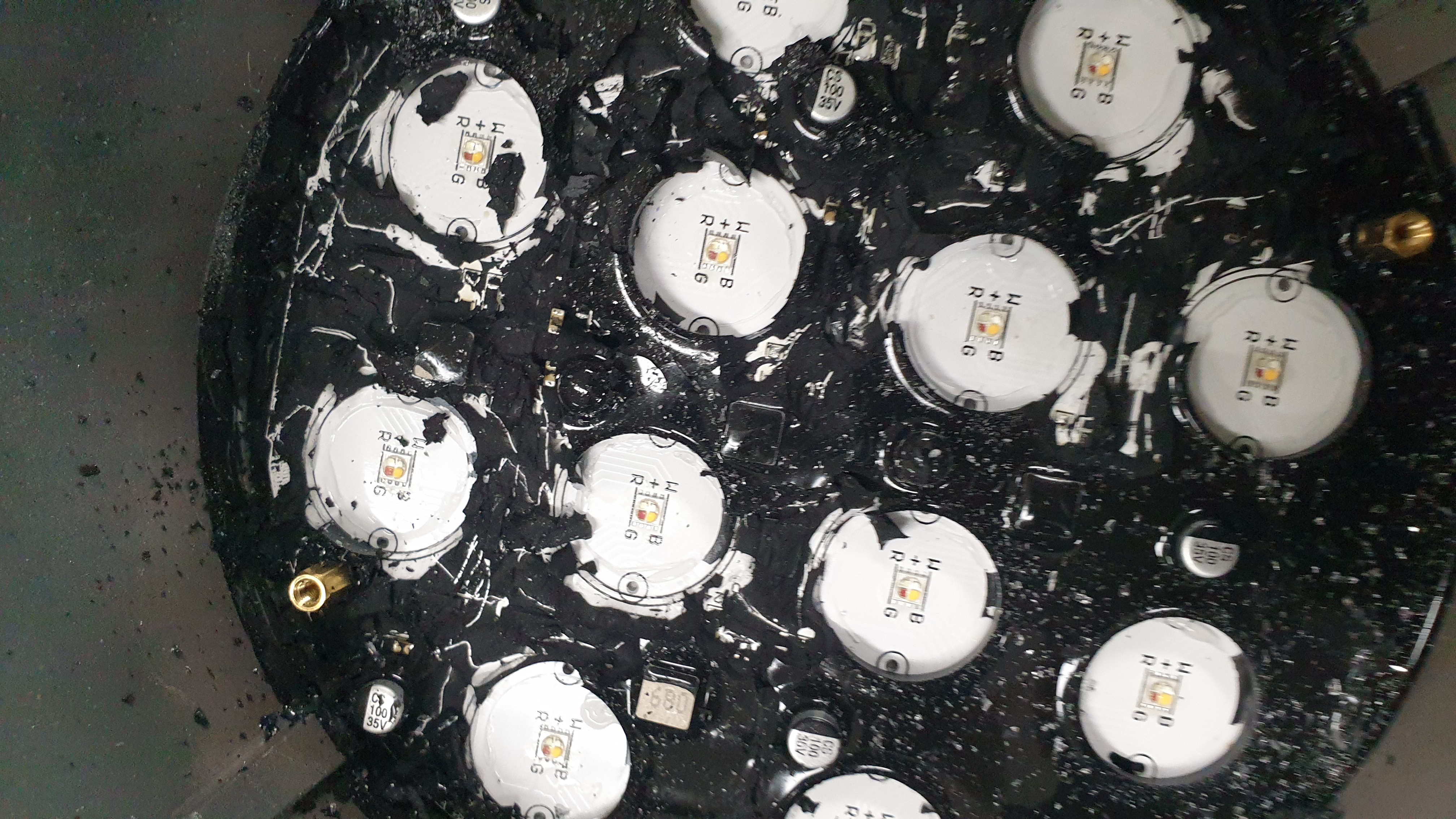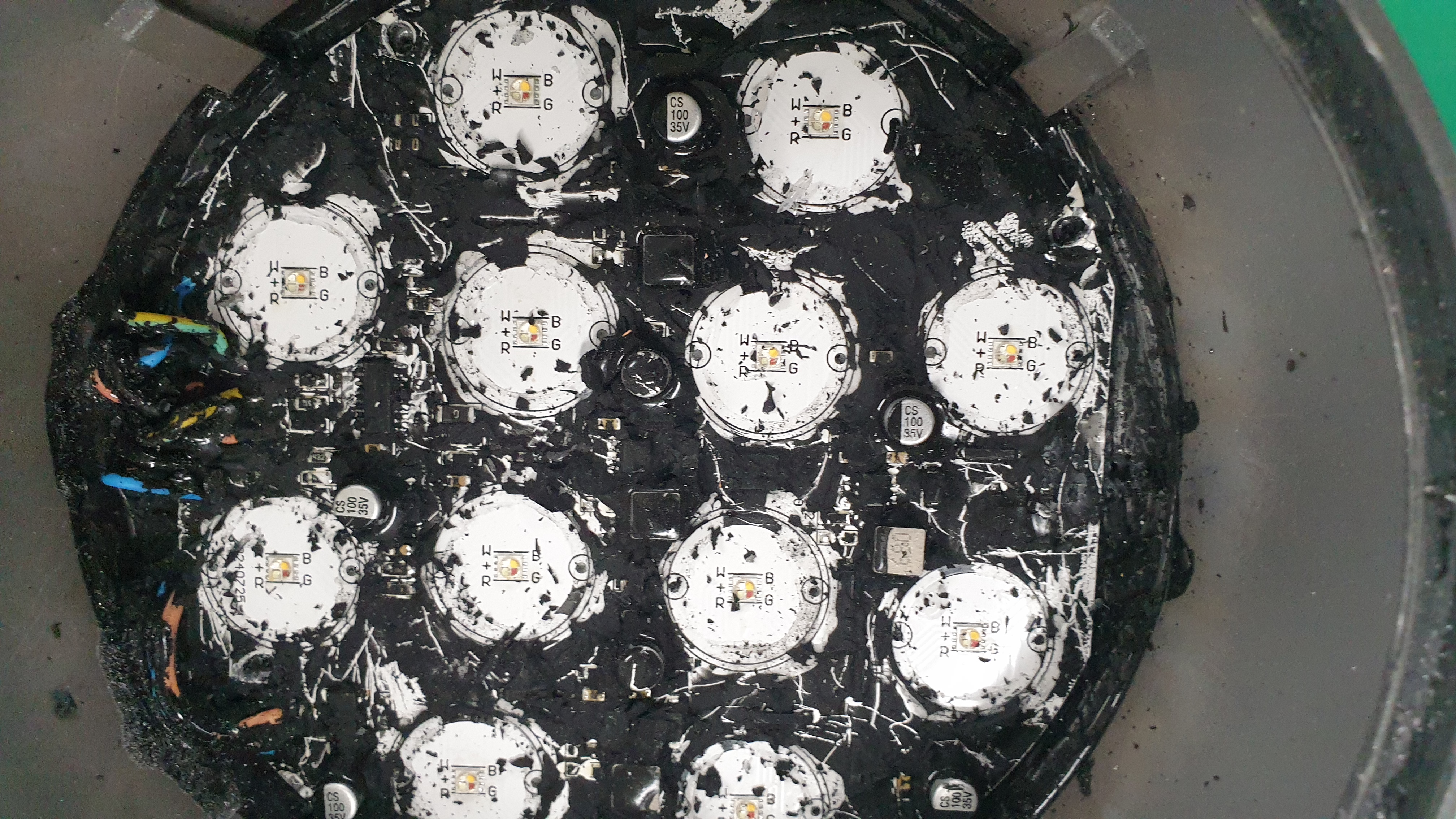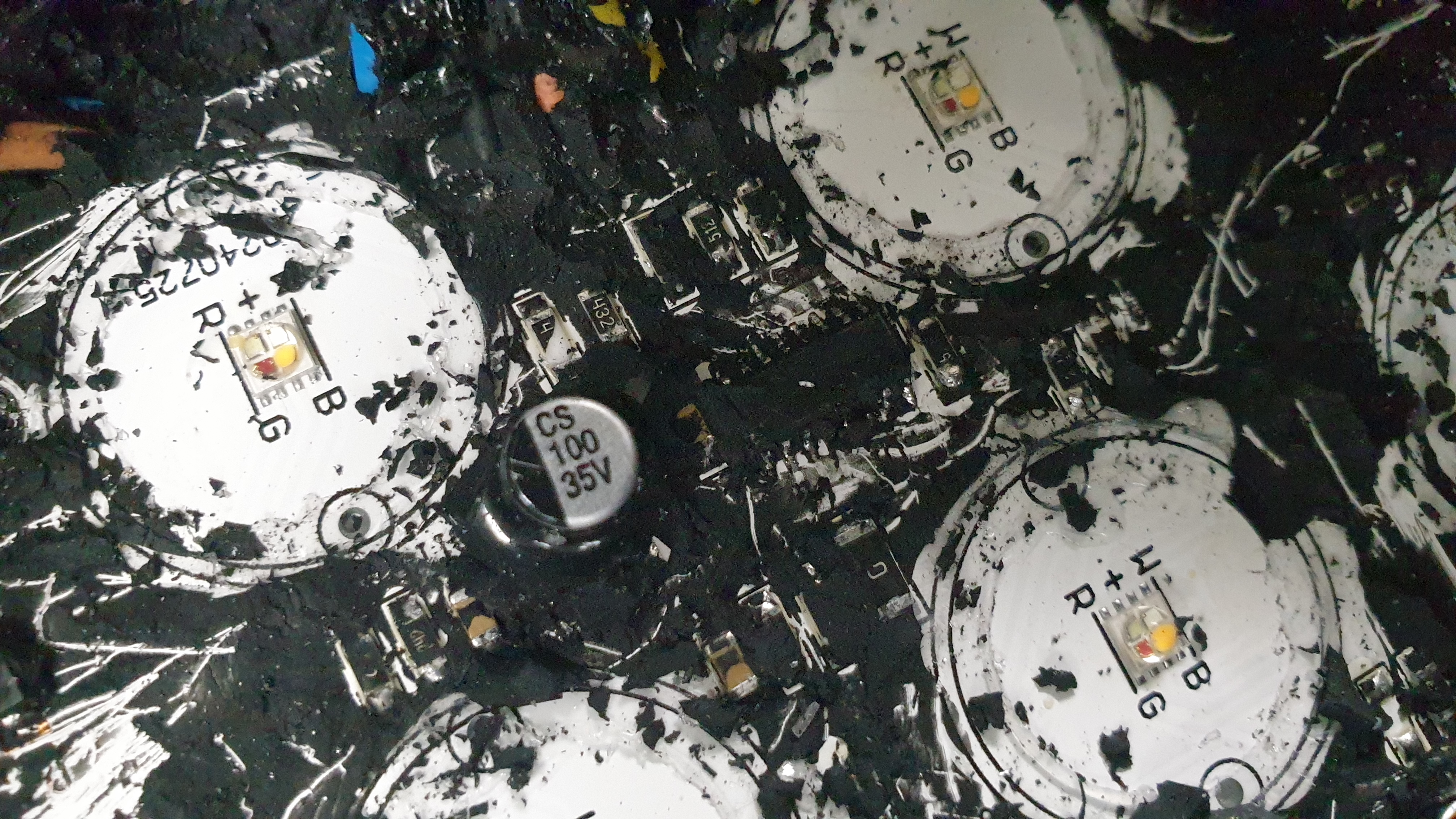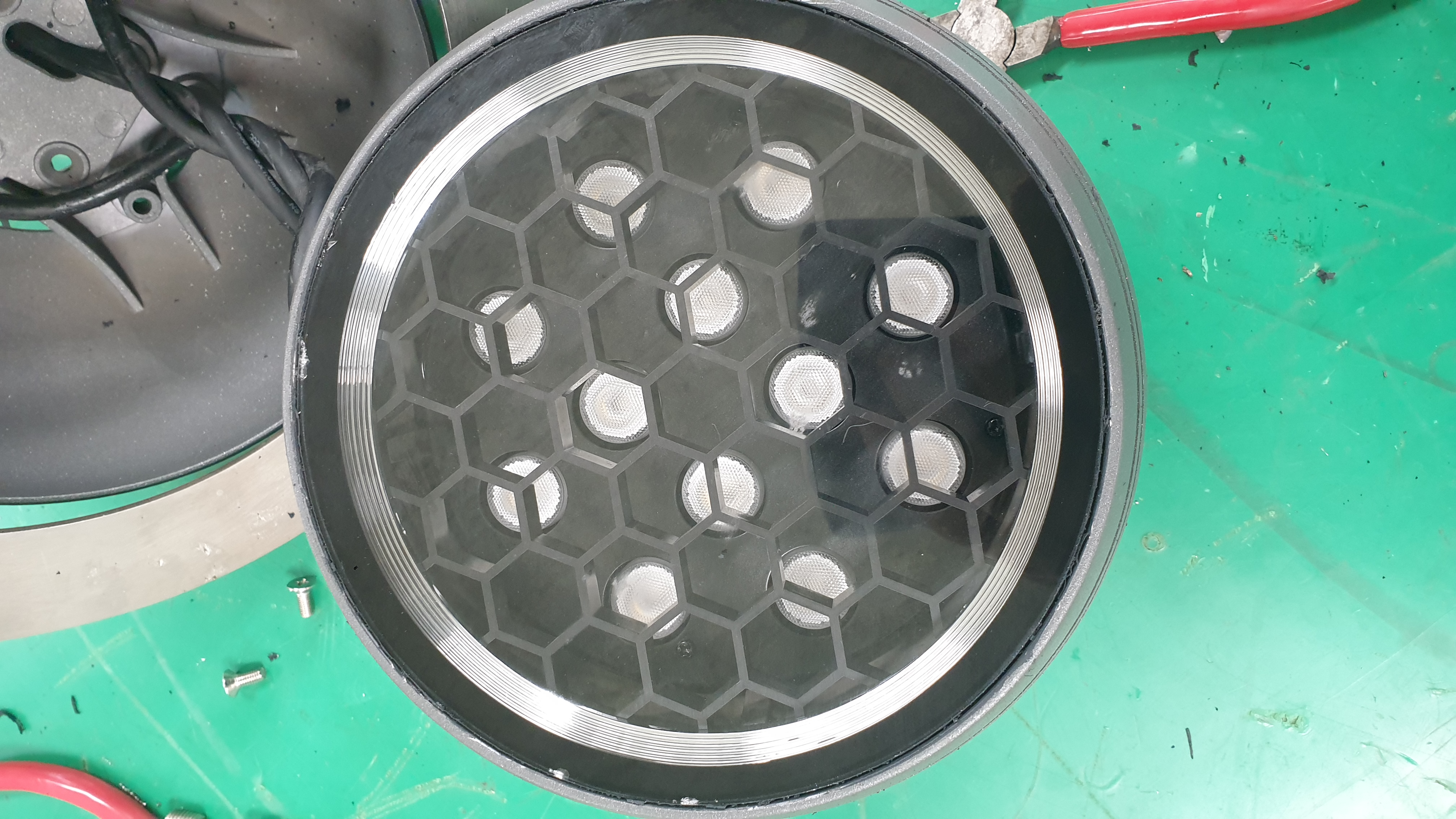 강화유리를 깨서 분해를 했다. DMX수신 드라이버가 별도로 있는 줄 알았는데 메탈 PCB부품면에 배치되어 있다.