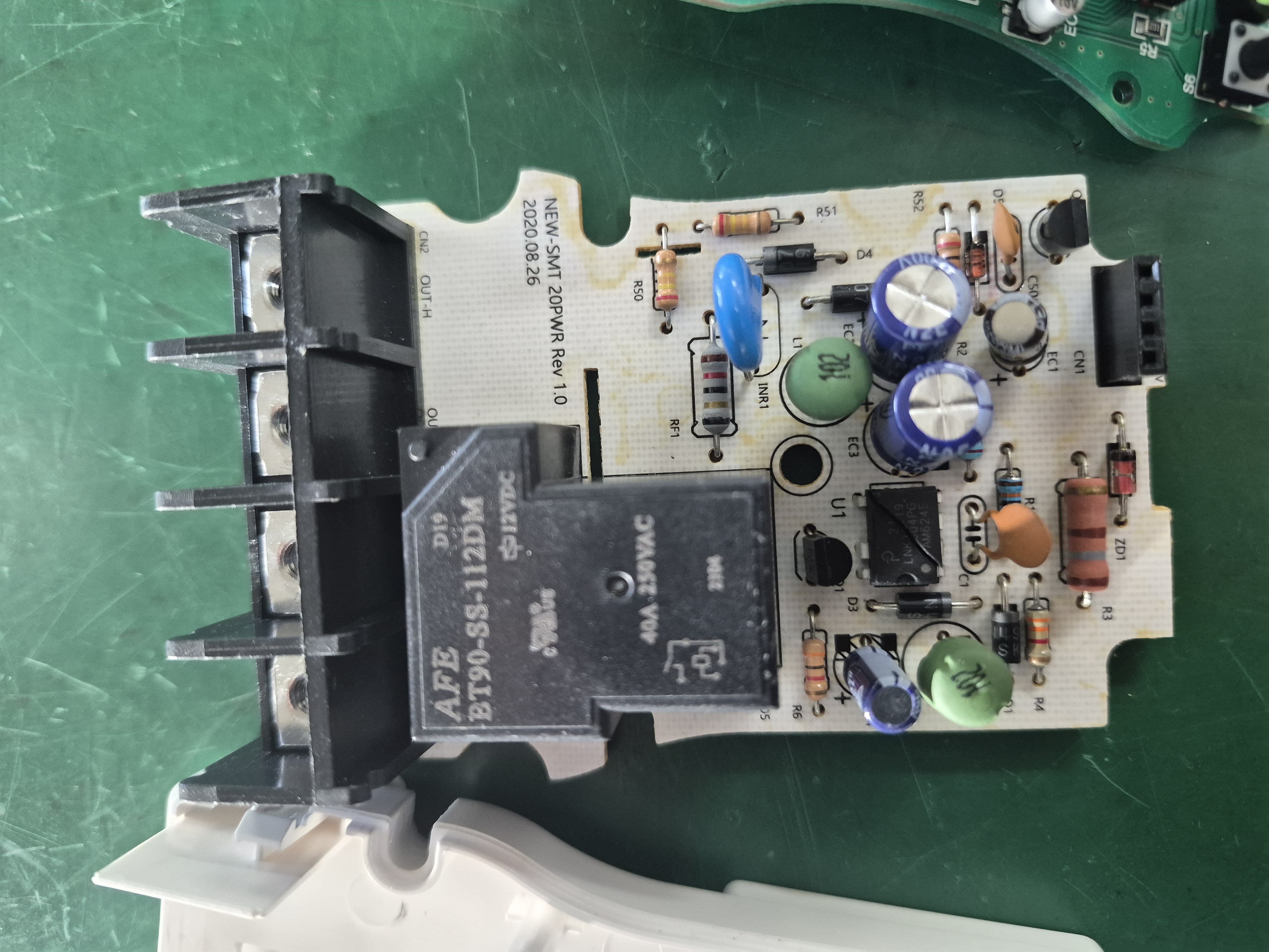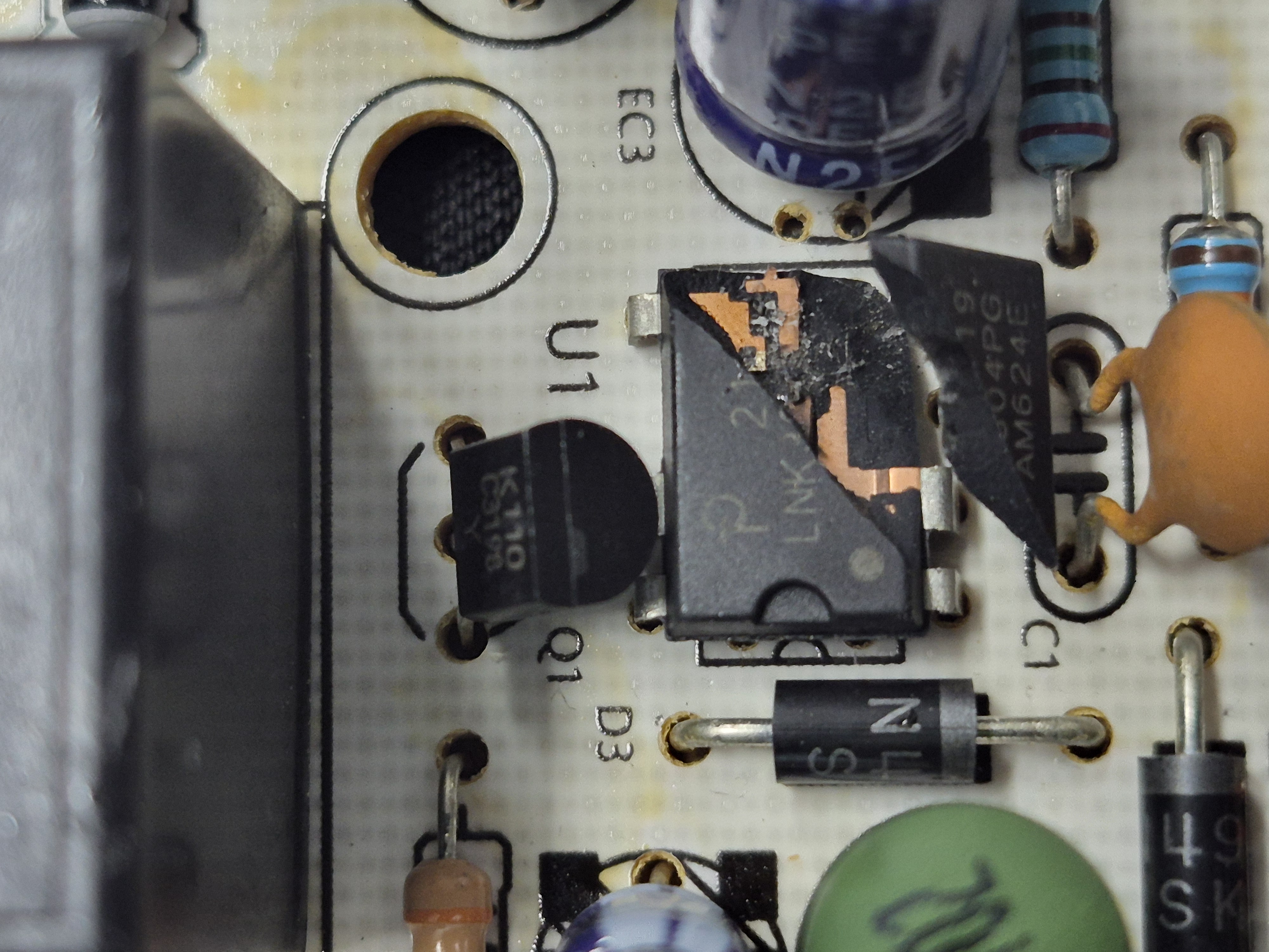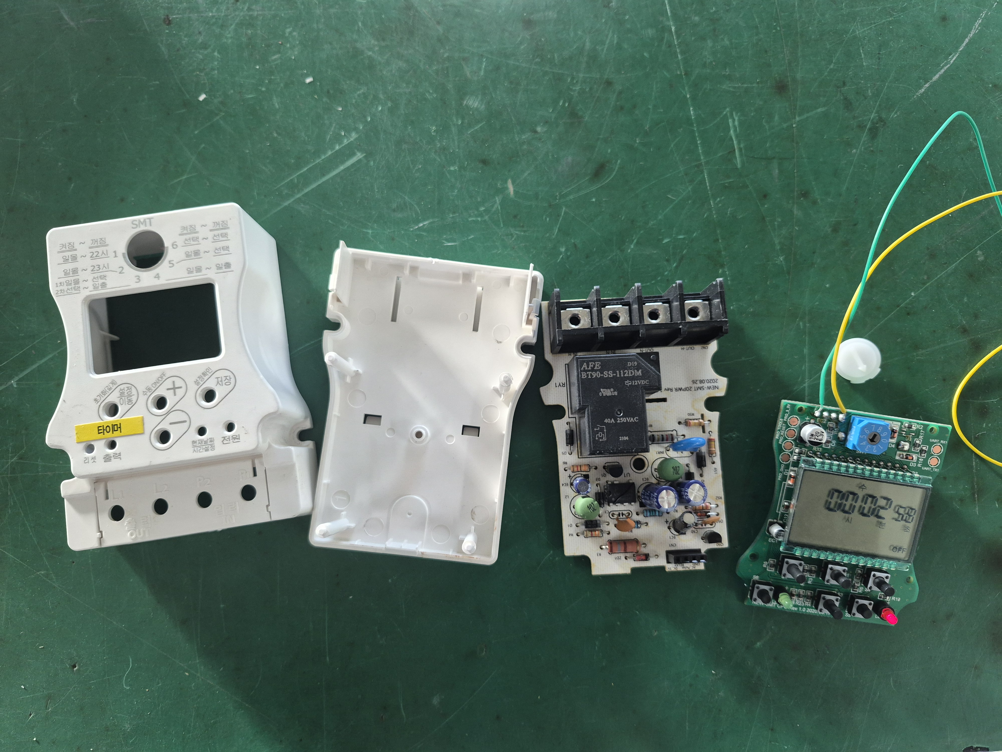 일몰일출 타이머의 액정표시도 없다. 분해해서 확인하니 비절연 전원제어 IC가 파괴되어 있었다. TR도 파괴되었다. 외부 입출력 단자에 반대로 접속해 발생된 상태다. IC를 공업용 히트건과 롱노우즈플라이어 이용해 파괴된 DIP IC를 빼내고 스위칭 TR은 TO-92형을 제거하고 SMD SOT-23 타입으로 변경해 땜을 실시해 수리를 완료했다.