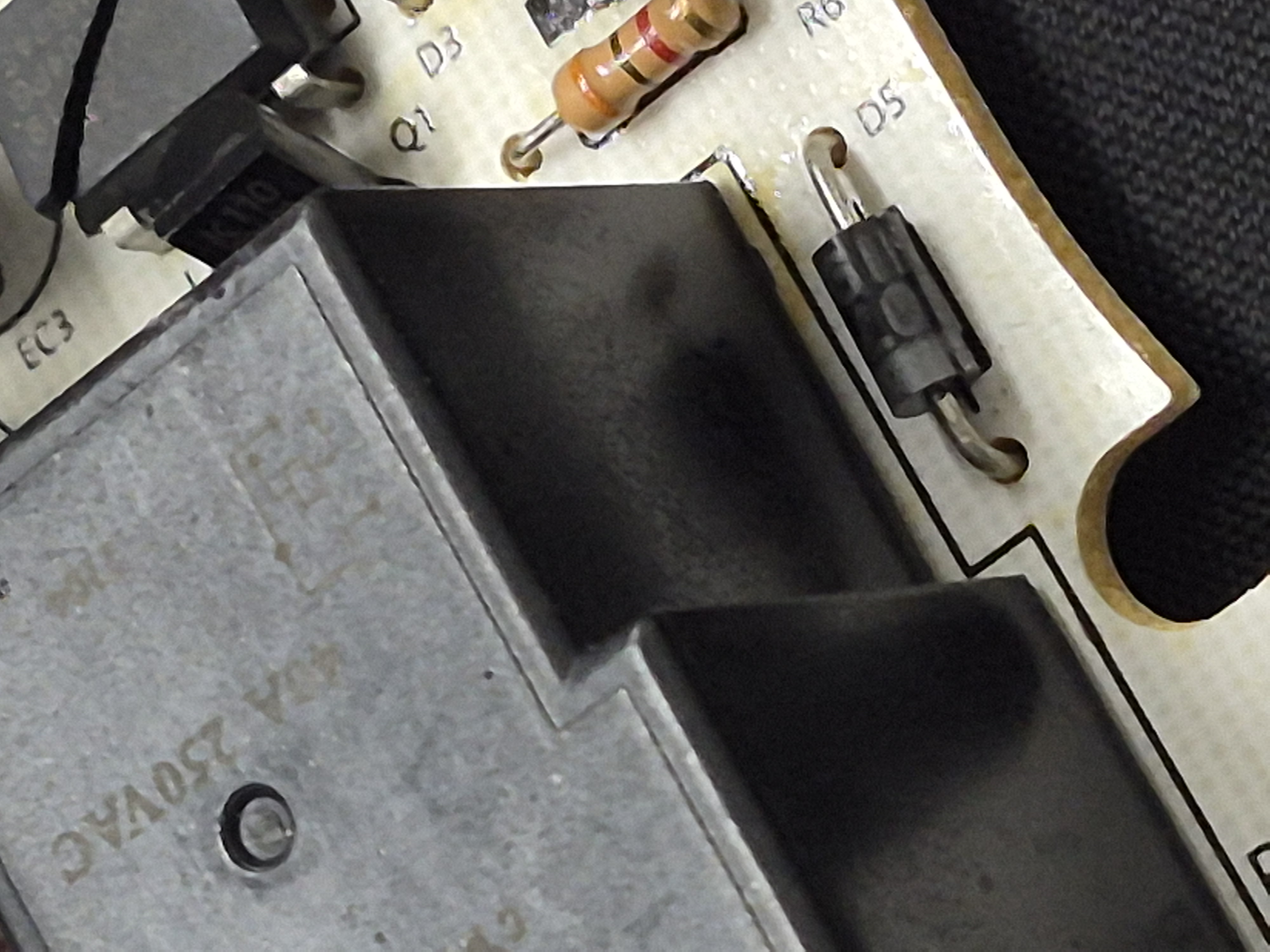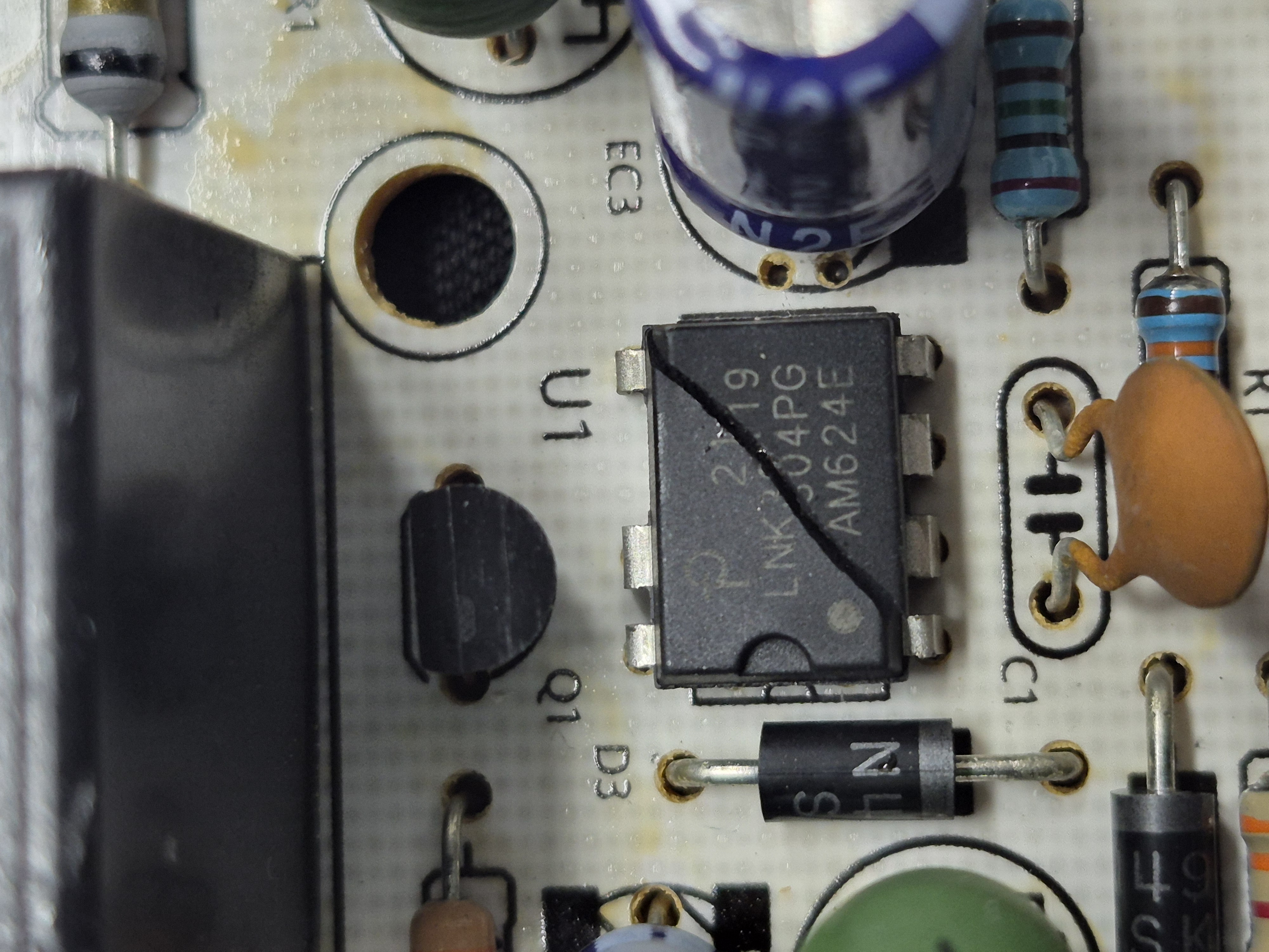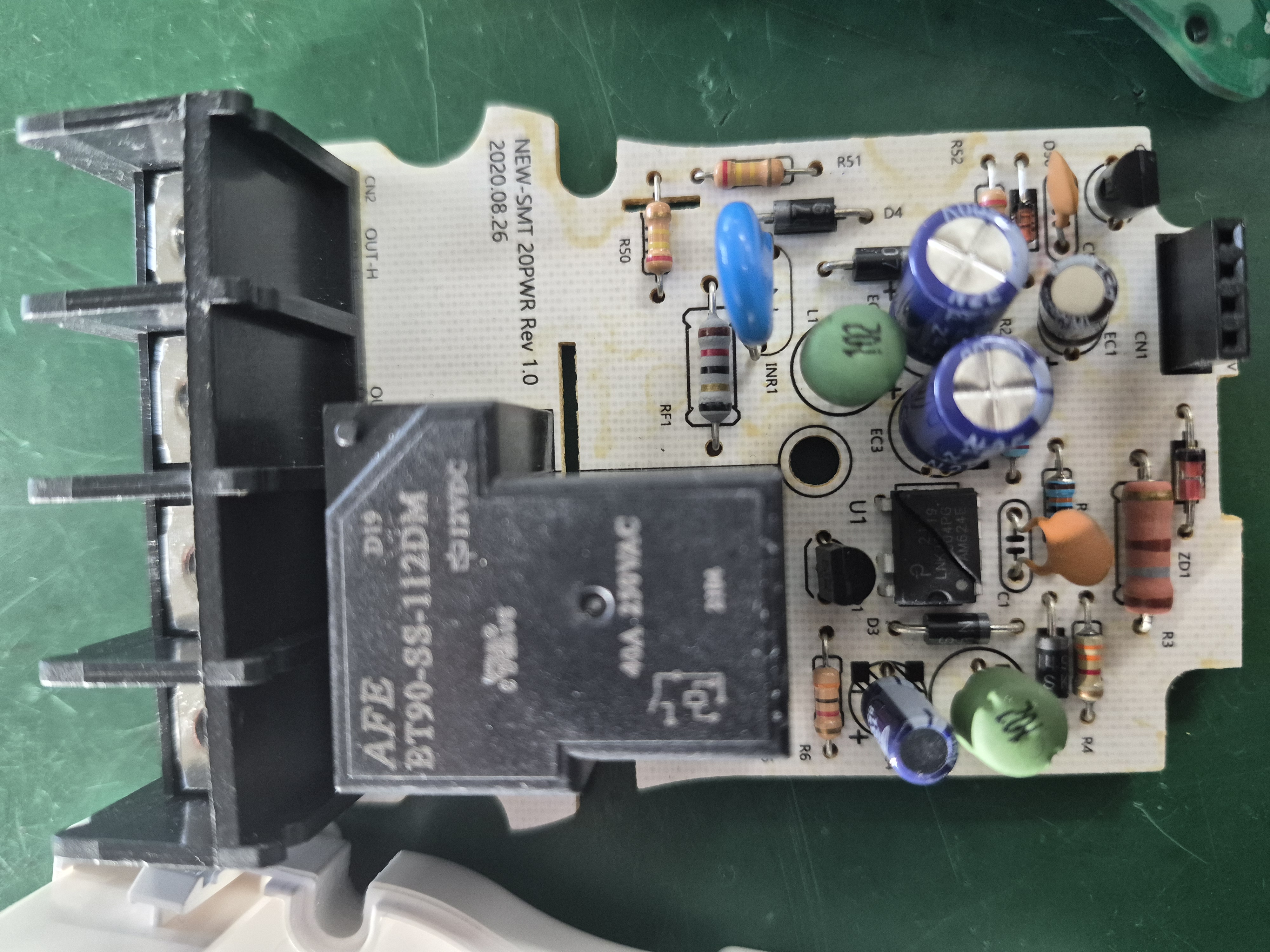 일몰일출 타이머의 액정표시도 없다. 분해해서 확인하니 비절연 전원제어 IC가 파괴되어 있었다. TR도 파괴되었다. 외부 입출력 단자에 반대로 접속해 발생된 상태다. IC를 공업용 히트건과 롱노우즈플라이어 이용해 파괴된 DIP IC를 빼내고 스위칭 TR은 TO-92형을 제거하고 SMD SOT-23 타입으로 변경해 땜을 실시해 수리를 완료했다.