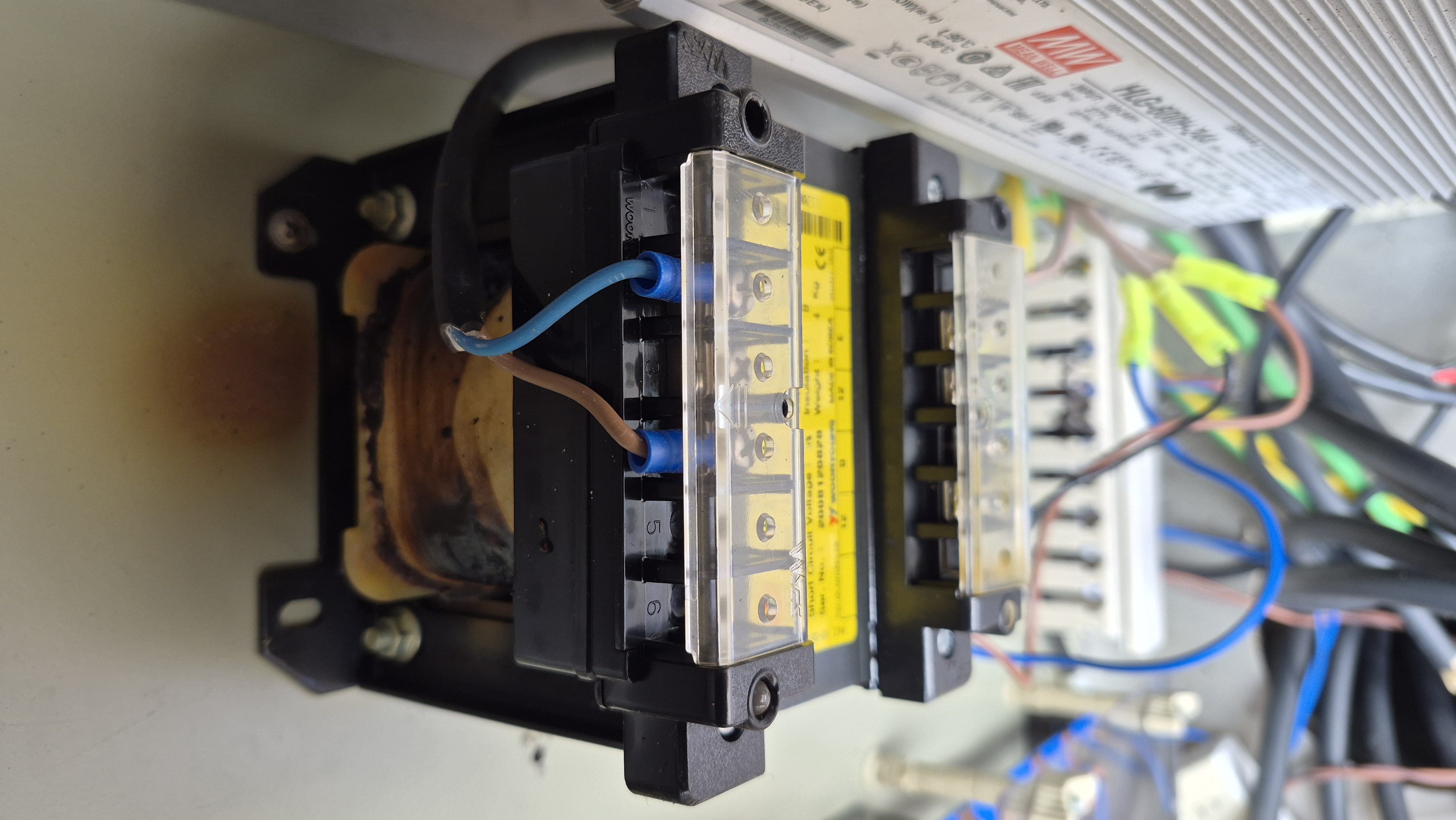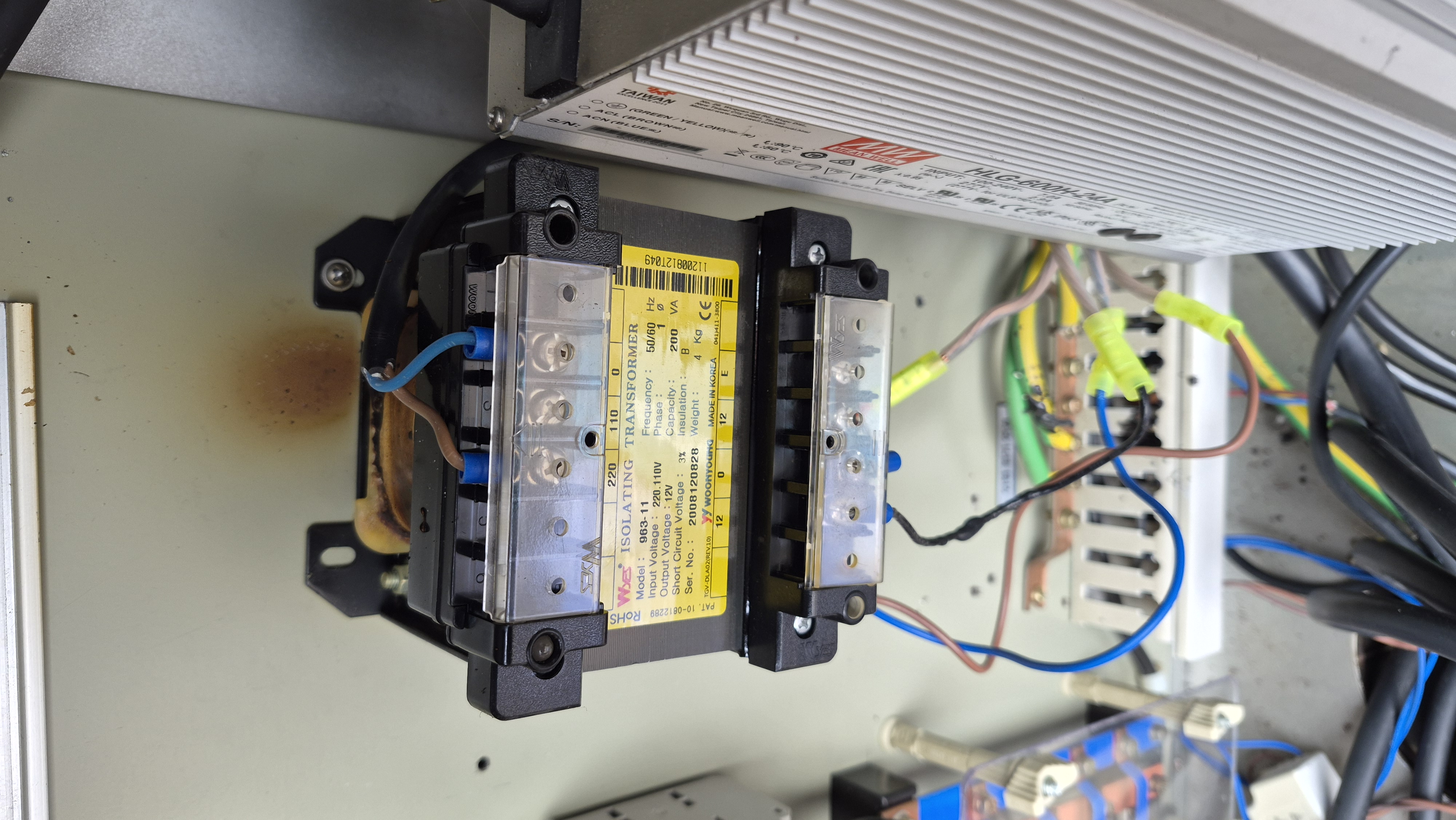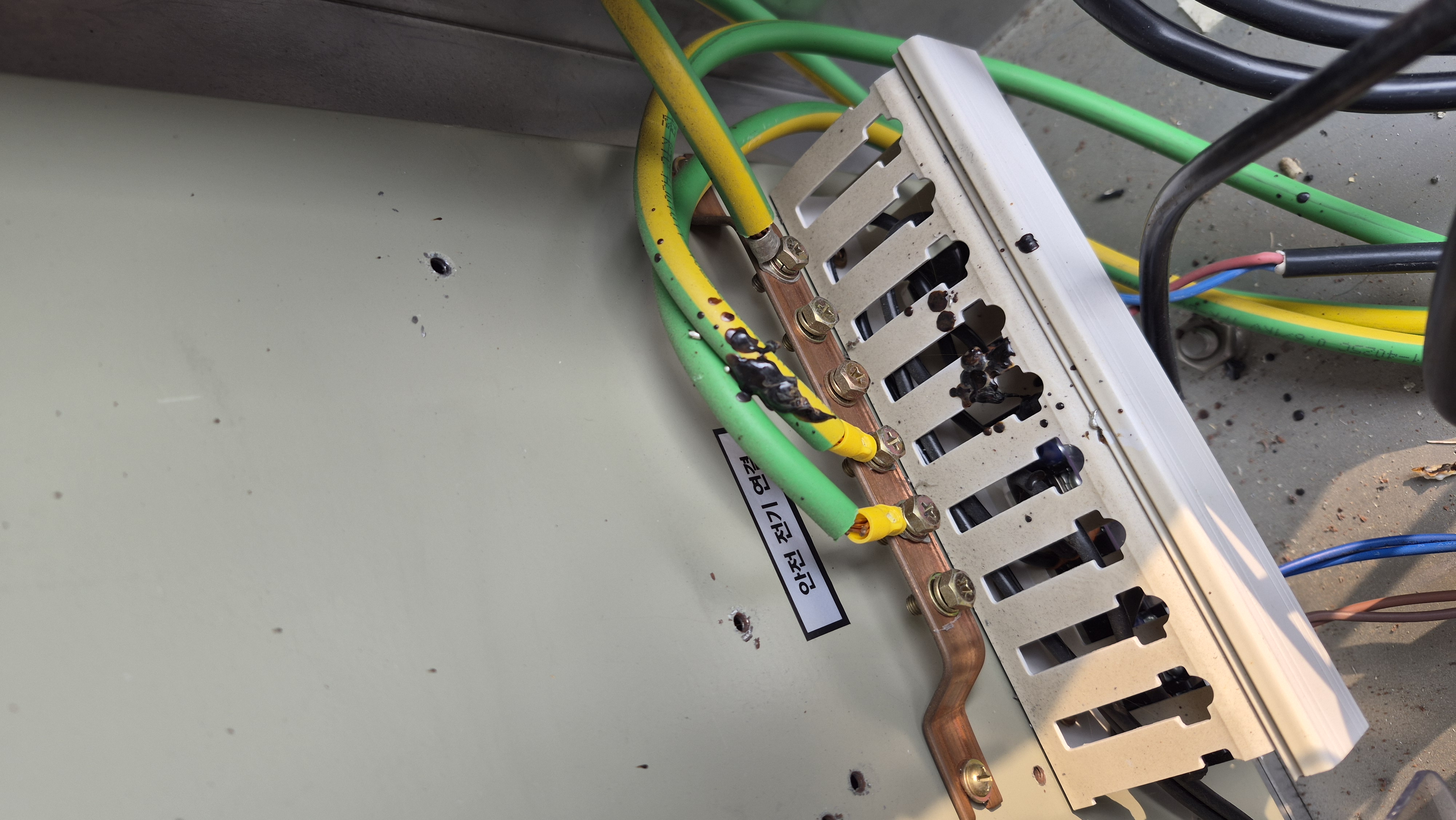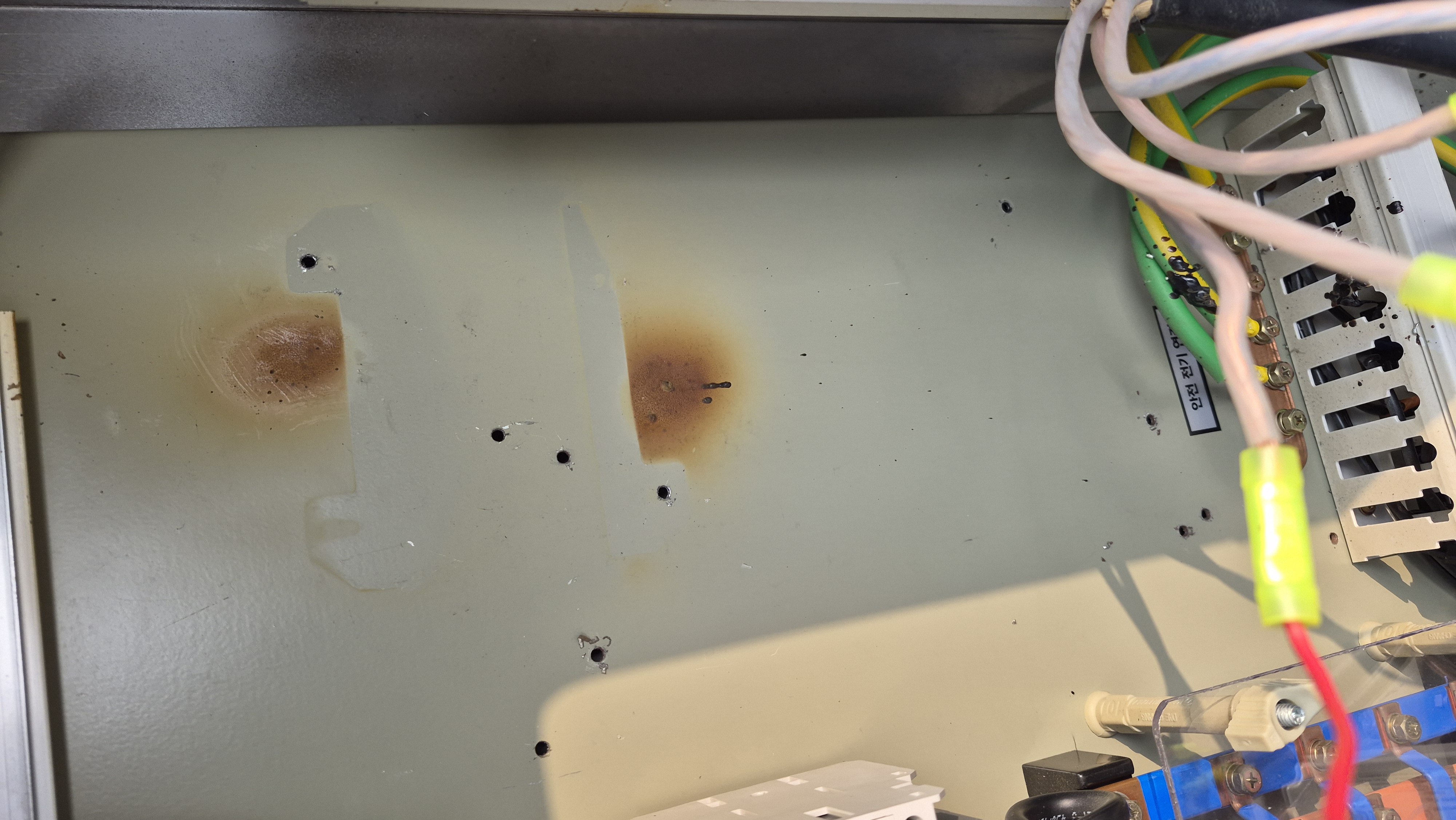 다행히 누전차단기가 떨어져 있었다. 변압기로 인한 화재예방에 있어 온도휴즈가 없다는 것이 이해가 되지 않았다. CE인증까지 되어 있는데 Made in Korea로 인쇄된 라벨도 부착되어 있었다. 운영이라는 회사다. 국내 제조가 아닌 중국산 제조로 보였다. 업체 개선을 위해 탄 변압기는 Feed-Back 하도록 했다.